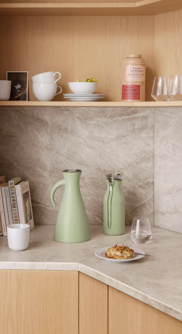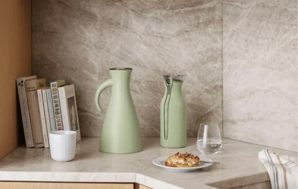 Det skulpturelle design af termokanden bygger på et prisvindende koncept, der med en hældekrave i rustfrit stål sikrer, at kanden er 100% drypfri. Den brede åbning i toppen gør det nemt at fylde kanden, som både kan bruges til varme og kolde drikke. Udvendigt er den lavet af holdbart kunststof, mens den indvendigt har en glaskolbe, som holder drikkevarer varme eller kolde i lang tid. Termokanden er også effektiv til at holde en halv kande varm og holder tæt, selv når den ligger ned.