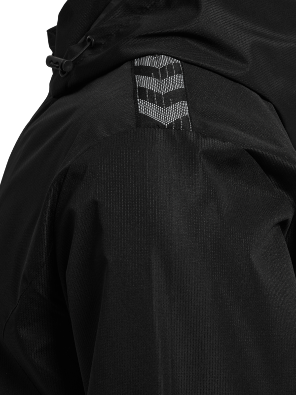 Hovedside: Vævet stof / Stormmanchet: Interlock-stof / For: Mesh-stof og taft. Trykt logo. Chevron tape ved skuldrene. Snøre med snorestopper i hætte til voksenstørrelser. Snøre med snorestop forneden. Lynlåslomme i siderne. Stormmanchet med tommelfingerhul.