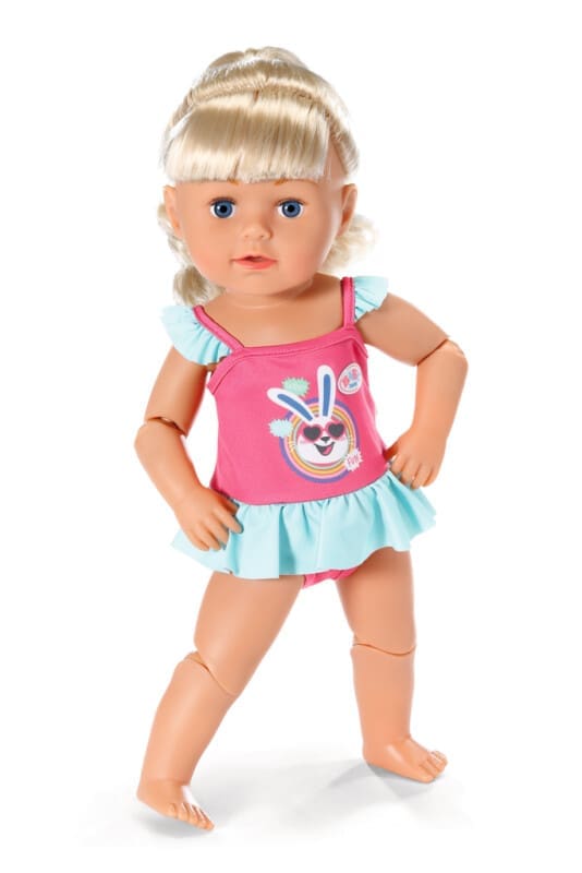 Ned i det kolde vand. I de farverige badedragter har BABY born og BABY born Søster det endnu sjovere, når de svømmer i poolen eller søen.