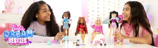 Barbie Dream Besties-dukkerne tilskynder børn til at dele deres unikke talenter med verden ligesom Renee! Renee drømmer om at have et mad- og rejseprogram. Hjælp hende med at skabe vlogs med 11 stk. tilbehør, herunder en pizza, en kringle og en bærbar computer! Modedukken har langt, sort hår med lilla, skinnende highlights til styling. Barbie Dream Besties-dukkerne inspirerer børn fra 4 år for at drømme stort og udleve deres drømme. Dukken kan ikke stå af sig selv. Farver og mønstre kan variere. Fra 4 år.