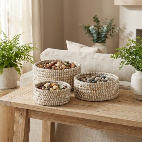 The Hamilton set includes handcrafted baskets with a round shape, offered in three graduated sizes featuring heights of 9.5 cm, 8.0 cm, and 11.5 cm as well as diameters of 26.0 cm, 22.0 cm, and 30.0 cm. Made of a combination of plastic and straw in white color, the design follows a natural living style. The careful workmanship and choice of materials emphasize the high-quality execution.
