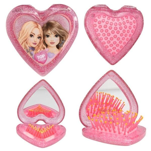 Lille hjerteformet, folde hårbørste fra TOPModel med spejl. Passer perfekt til lommen eller tasken. Fås i to forskellige farve- og motivvarianter: transparent pink og lilla med glittereffekt.