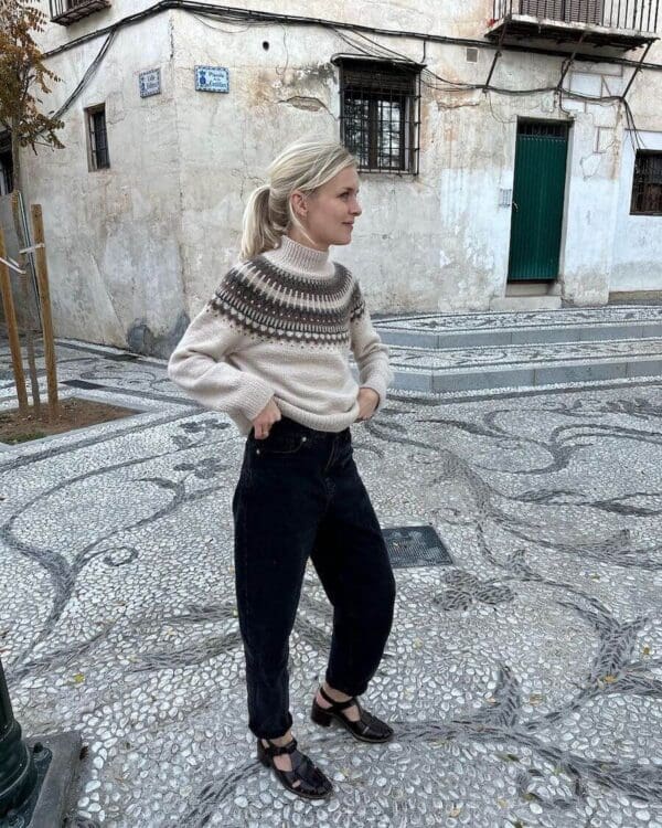Den lyse Celeste Sweater er strikket i Peer Gynt fra Sandnes Garn i farverne Almond [2511] (bundfarve), Shell melange [2710] (mønsterfarve 1), Mellombrun melert [2652] (mønsterfarve 2), Charcoal melange [1065] (mønsterfarve 3) og Muskat melange [3070] (mønsterfarve 4).