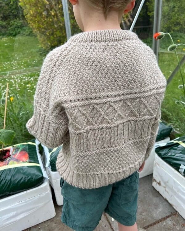 Den lyse Ingrid Sweater Junior er strikket i Peer Gynt fra Sandnes Garn i farven Marsipan [2321].