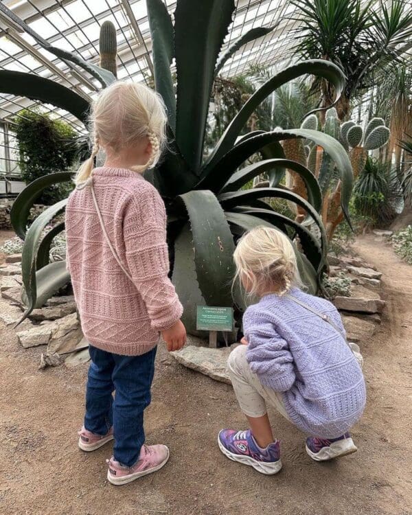 Den lyserøde Storm Sweater Junior er strikket i Peer Gynt fra Sandnes Garn i farven Ballet shoes [3521].