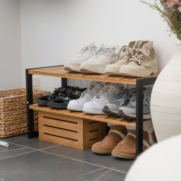 Har din entre også brug for førstehjælp, når det kommer til skoopbevaring? Blake er heltinden, der kommer ilende til og redder dig! Hun er en klassisk og stilig dame med med to hylder, lavet i det fineste træ med lameller, og et sort stel. Hyldernes lameller er ikke bare et fint visuelt touch, de sørger også for at dine sko kan ånde – det er bl.a. praktisk, når det er regnvejr (og er det ikke nærmest altid det?).