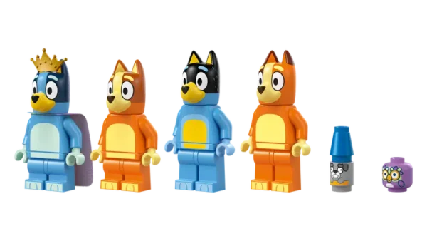 Modullegehuset med flere rum har 4 minifigurer –Bluey, Bingo, Chilli (Blueys mor) og Bandit (Blueys far) – samt tilbehør, bl.a. regnbuekappe, tryllestav og forstørrelsesglas. Alle rum er aftagelige og giver mange måder at lege på. I legerummet er der dukkehus, klaver og legekøkken med madbod. I køkk enet er der køleskab, ovn, komfur, bord og stole. Ovenpå er mor og fars soveværelse og et badeværelse. På Bluey og Bingos værelse på loftet er der et tæppe, en lampe og figuren af Pludregøj. I rummet ved siden af er dronningens trone, komplet med tekande, kop og frø. I haven er der et stort træ, en hotdog, pizza, vandhane, havenissen Jeremy og en ballon til at slå op i luften.