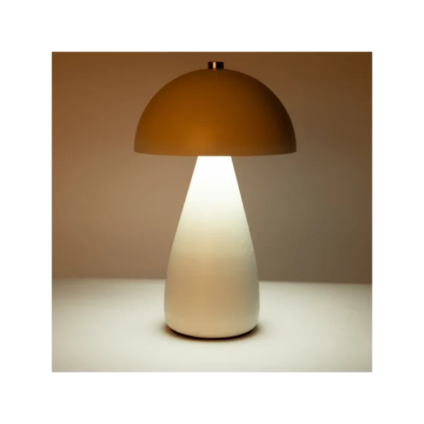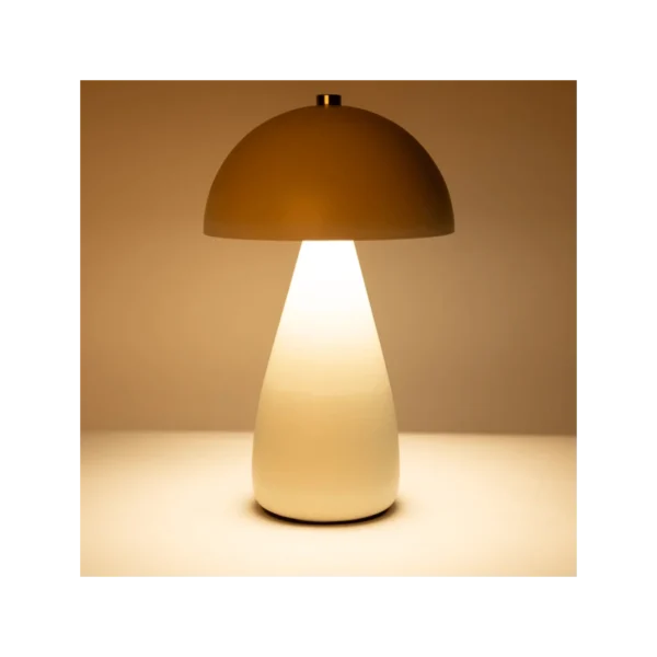 Trådløs svampeformet bordlampe. Fremstillet af cremefarvet metal. Giver hyggelig og blød belysning til sene aftener, hvilket gør den ideel til natborde, sofaborde eller skriveborde. Bordlampen har tre lysniveauer og en indbygget lysdæmper. Skift mellem varmt, køligt og neutralt lys med et enkelt tryk på lampen. Tryk og hold for at justere lysstyrken. Den er let fuldt opladet ved hjælp af det medfølgende USB-kabel på cirka 4 timer. Afhængigt af lysstyrkeindstillingen kan lampen lyse i op til 20 timer.