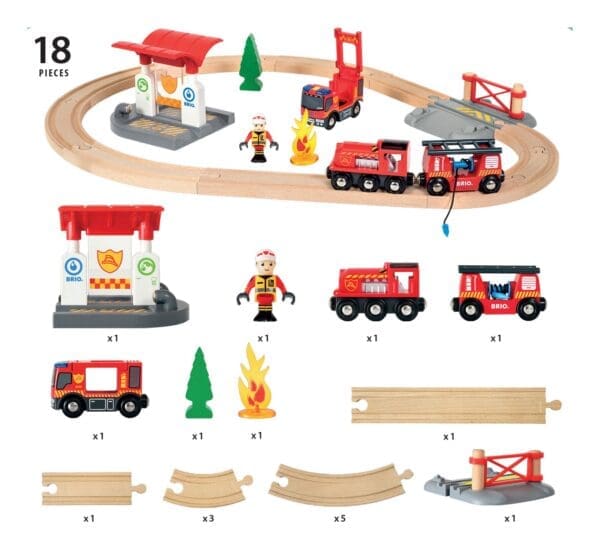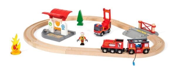 • Der er brand i nærheden af skoven, de har brug for din hjælp! Fyld brandtoget med vand ved dockingstationen så hurtigt som muligt. Med masser af tilbehør, skinner, tog og sæt at samle på, er dette trætogsæt et fantastisk sted at starte din egen BRIO World#(cr)Skinnelayoutet måler 57 x 48,5 cm og indeholder 1x lokomotiv, 1x anhænger med slange, 1x brandbil, 1x dockingstation, 1x træ, 1x brandmand, 1x jernbaneoverskæring, 10x skinnestykker#(cr)BRIO tog, lokomotiver, vogne, vogne og køretøjer har de klassiske BRIO magnetiske koblinger for nem tilslutning! Alle togsæt, skinner, tilbehør og destinationer har det klassiske trætogspor, der giver mulighed for nem tilslutning til hinanden og udvidelse af din egen BRIO World.#(cr)BRIO Worlds jernbaneserie er egnet til alderen 3 år og opefter og er ideelle gaver til drenge og fantastiske gaver til piger. Dette produkt er lavet af plastik af høj kvalitet og FSC®-certificeret træ. Ved at vælge dette produkt støtter du ansvarlig forvaltning af verdens skove.#(cr)Vi ved, at børn nogle gange leger med legetøj på andre måder end forventet. Derfor tester vi vores produkter grundigt i henhold til vores strenge sikkerhedskrav, som i mange tilfælde er strengere end de lovmæssige krav. BRIO-togsæt er en fantastisk fødselsdagsgave eller en flot julegave#(cr)