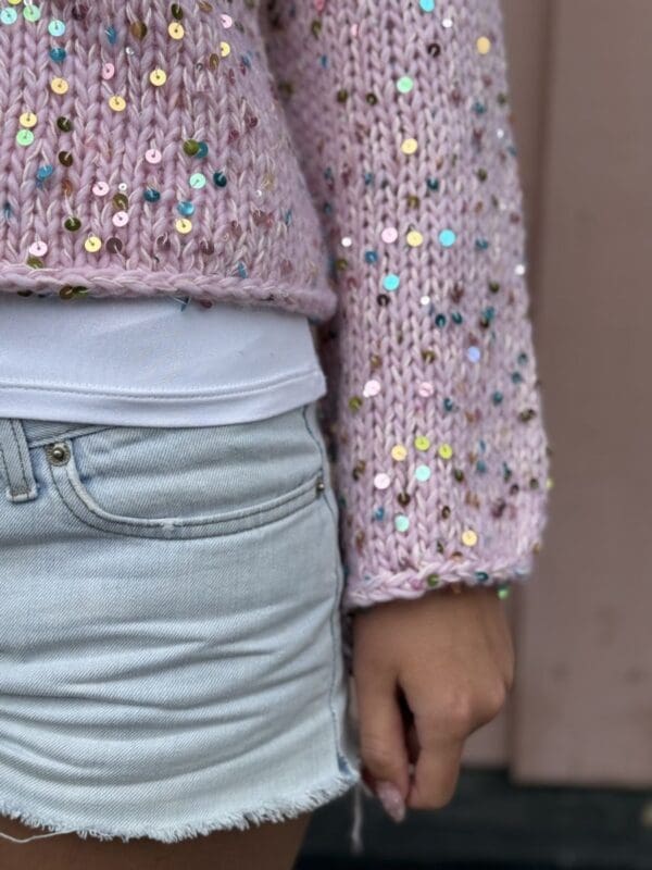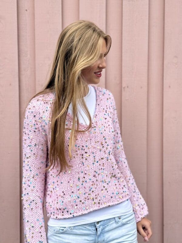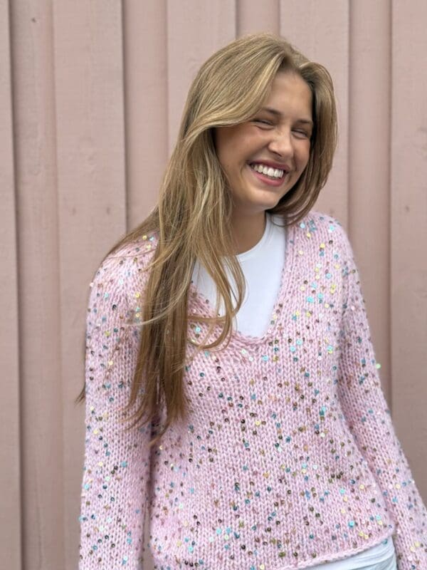 En løs, dejlig sweater strikket på tykke pinde med uld- og Disco-pailletgarn. Perfekt til hverdag eller fest.