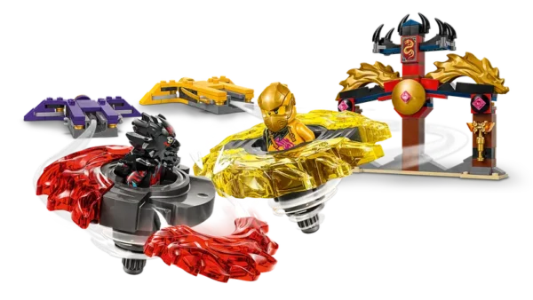 Børn kan nyde fantastiske eventyr med rolleleg, når de iscenesætter opgør mellem det gode og det onde med Arins gule spinner og Ras’ røde spinner, som begge har aftagelige kraftelementer. NINJAGO-figurerne kan opgradere deres spinnere med gyldne elementer, som de kan vinde ved at ramme kamparenaen og få den til at styrte sammen.