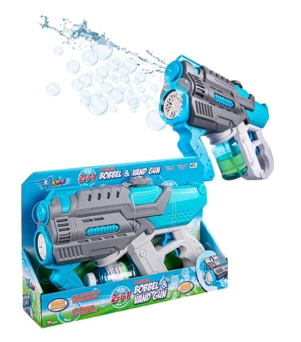 2-i-1 batteridrevet sæbeboble-/vandgevær. Skyder både med vand og sæbebobler. Inkl. sæbeboblevand. Ekskl. 4 stk. AA-batterier.