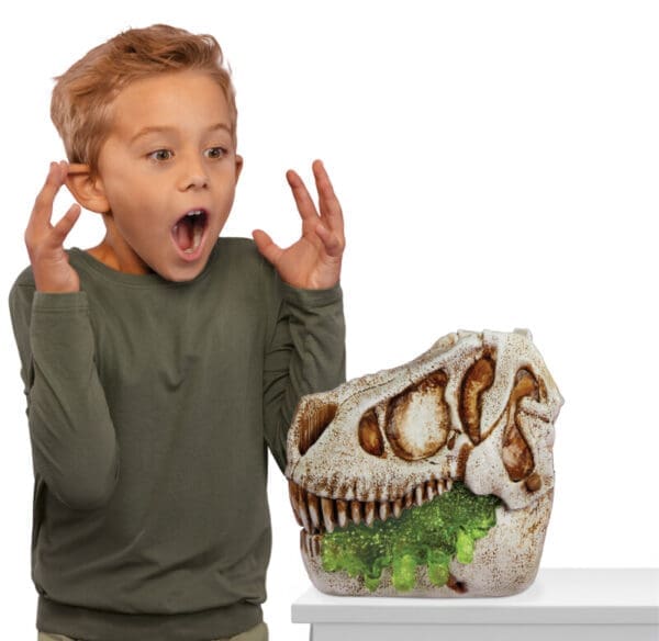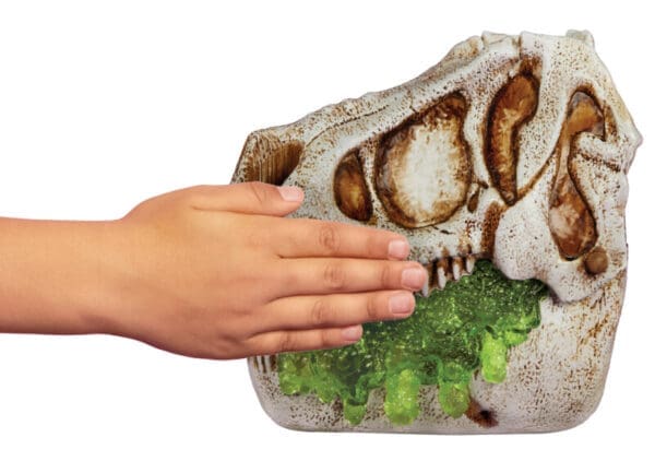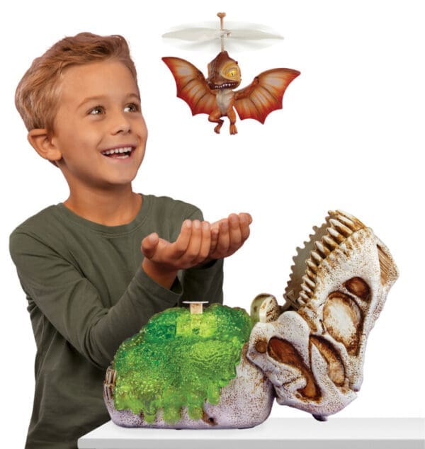 Ryst og prik til den sovende dino for at vække ham. Når dinoen åbner sine kæber i et kæmpe brøl, vil du se en anden mindre dinosaur slippe ud og flyve afsted. Hold hånden under minidinosauren for at guide ham så højt du kan. Du kan gentage udpakningen igen og igen. Fås i 3 varianter. Saml dem alle. Fra 4 år.