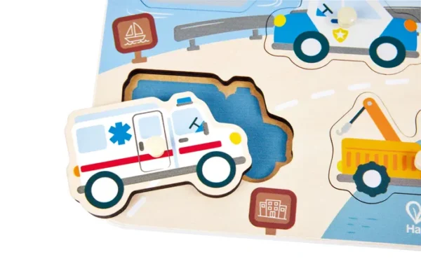 Lær alt om udrykningskøretøjer og hvordan de hjælper os! Tip: Løs puslespillet ved at matche formerne eller billederne med de rigtige huller, og opfordr dit barn til at sige navnene på køretøjerne under legen. Fra 18 mdr.