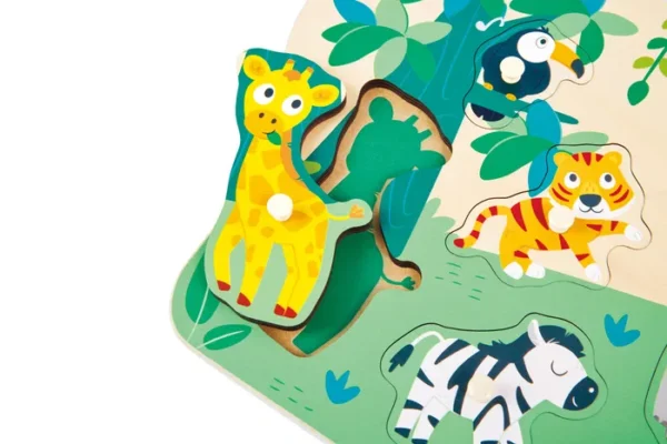 Elsker du vilde dyr? Lær mere om dem og hvor de bor med dette farverige knoppuslespil. Tip: Løs puslespillet ved at matche formerne eller billederne med de rigtige huller, og opfordr dit barn til at sige navnene på dyrene under legen. Fra 18 mdr.