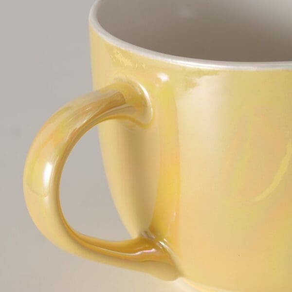 The Iridesa jumbo mug is crafted from premium New Bone and features a glazed finish with a distinct pearl effect. Its light yellow color, round shape, and ample 11.5 cm diameter allow for a maximum capacity of 560 ml. The mug is suitable for dishwasher and microwave use. Height: 8.5 cm.