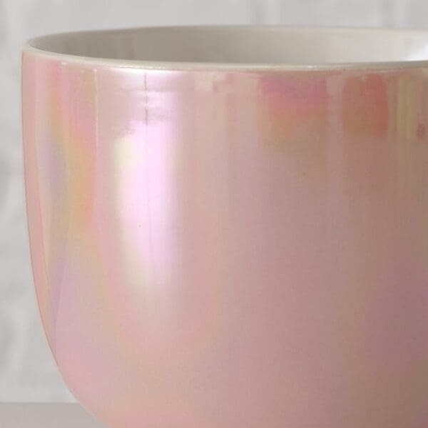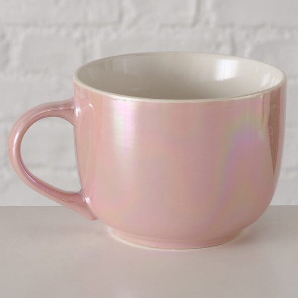 The Iridesa jumbo mug is made of glazed New Bone porcelain with a pearlescent effect in light pink. Measuring 8.5 cm in height and 11.5 cm in diameter, it offers a capacity of 560 ml. The round design and high-quality finish ensure durability. The mug is dishwasher and microwave safe, allowing for easy maintenance in everyday use.