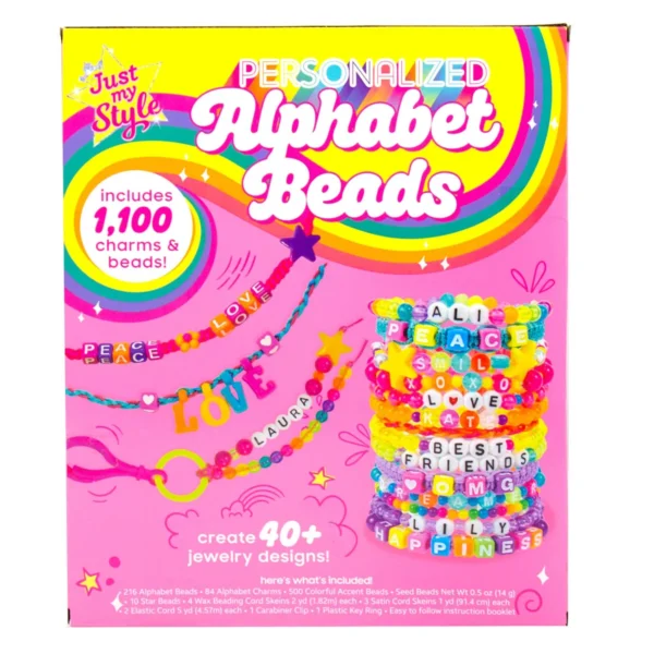 Lav og tilpas dit eget smykke med dit navn eller yndlingsord med Just My Style® ABC Perler! Skab over 40 forskellige smykkedesigns, du kan matche, bære og dele. Med 1.100 farverige charms og perler til at mikse og matche, kan dine kreationer passe til enhver stil! Flet, knyt og væv forskellige snore for at tilføje sjove mønstre og teksturer til dine smykker. Lav armbånd, nøgleringe, halskæder og meget mere. Perfekt til en hyggelig overnatning, fødselsdagsfest eller gav! Fra 6 år.