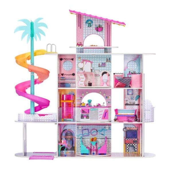 Tjek dette vilde hus ud! Det gflotte L.O.L. Surprise OMG House of Surprises kommer med mere end 85 overraskelser, måler 122 cm i højden og 122 cm i bredden , er i 4 etager og har 10 værelser.