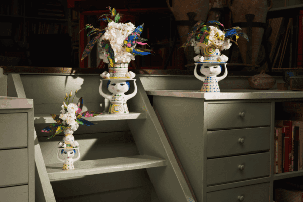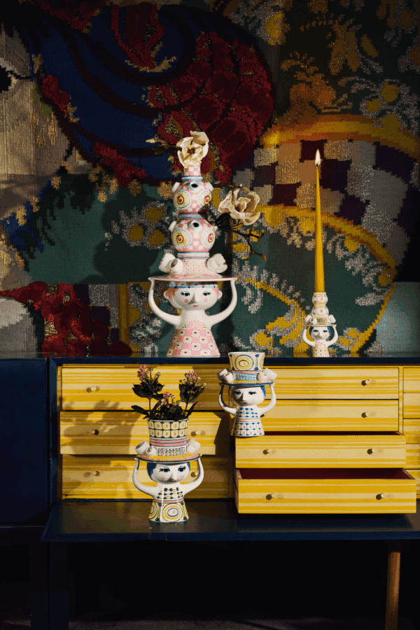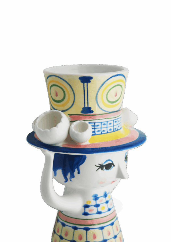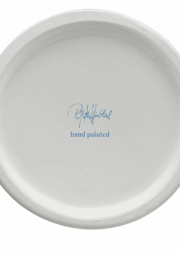 Invitér den nye hattefrøken indenfor, og lad hende skabe glæde i boligen med sine fine farver, finurlige detaljer og håndmalede dekorationer. Bjørn Wiinblad havde en forkærlighed for figurer med hatte, og arkiverne rummer utallige eksempler på, hvordan hatten dukker op igen og igen på nye, kreative og legende måder. Han designede selvfølgelig ikke små, fine pyntehatte. Nej, det var store voluminøse kreationer, der var både skulpturelle og avantgarde i deres udtryk – præcis som i serien Lady with hat. Vasen i blankglaseret keramik på 20,5 cm er præget af den blå farve, og skørtets stringente linjer står i skøn kontrast til hattens cirkulære former. Som et lille tårn vokser hatten op mod himlen, mens den fine frøken balancerer den med sine hænder. Det giver vasen et finurligt og fantasifuldt udtryk perfekt til blomsterbuketten i den legende boligindretning. En anden detalje, der er gennemgående i serien, er de små, figurative blomster, der er placeret langs skyggen på hattene. Endnu en dekorativ detalje inspireret af Bjørn Wiinblads originale former og farver. Præcis som Bjørn Wiinblad repræsenterer Lady with hat alt, hvad der er skørt, skævt, kreativt og vidunderligt.