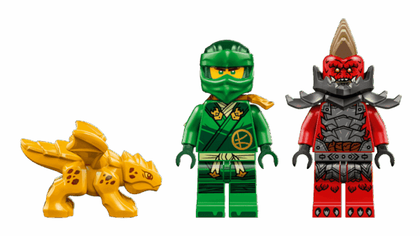 - 2 minifigurer – Lloyd bevæbnet med et gyldent katanasværd og en skurkagtig dragonisk spejderkriger med økse, så børn kan få spændende ninja-action