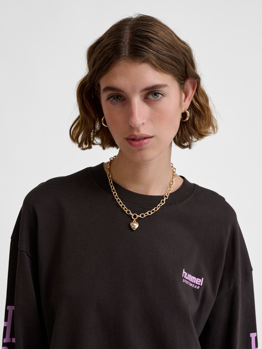 hmlLOOSE T-SHIRT L/S SW STADIUM er lavet af blødt, strikket jerseystof for ultimativ komfort. Den har en løs pasform og har dekorative prints på både bryst, ærmer og ryg.
