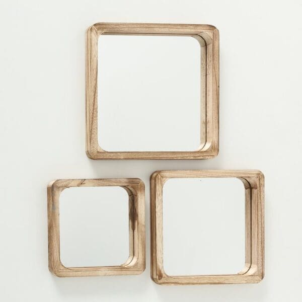The Mambo wall mirror features a square design with a clear mirror glass surface framed by Paulownia wood. Available in three different sizes, it can be mounted horizontally or vertically. The natural finish and adherence to the ‘Natural / Nature’ interior style make it suitable for assortment expansion in bedrooms, hallways, children’s or youth rooms, and bathrooms.