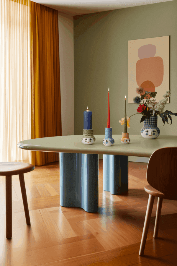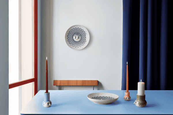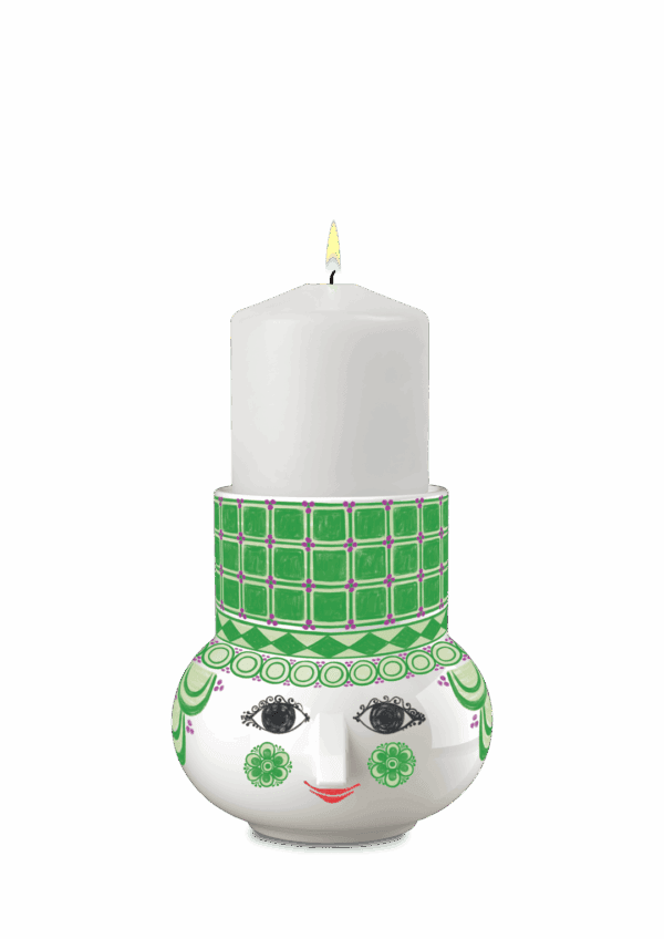 Udfold din farverige personlighed og skab plads til glæde med Bjørn Wiinblads Olga. Med sit søde smil, kulørte kinder og karakterfulde dekorationer rummer Olga på alle måder essensen af Bjørn Wiinblad som person og kunstner – også når hun tager form som lysestage. Glad og drømmende skaber hun liv og personlighed i indretningen med sit poetiske udtryk og sine sprudlende farver. Olga-lysestagen har samme runde form og cylindriske top som vaserne i Olga-serien, der så dagens lys i 2024 som en nyfortolkning af en ikonisk vase fra Bjørn Wiinblads imponerende designarkiv. Lysestagen prydes af et sødt rundt ansigt med de mandelformede øjne og den ikoniske trekantede næse, der nok nærmest er selve personificeringen af Bjørn Wiinblads kunst. Den store lysestage i serien til både fyrfadslys, kronelys og bloklys måler 12 cm i højden, og med en klar lysegrøn i kombination med prikker i lilla er der også fuld smæk på farverne. Alle Olga-lysestager er lavet af skinnende glaseret keramik med farverige decals, og dekorationerne er en skøn blanding af originale Bjørn Wiinblad-mønstre, der i en skøn varieret farvepalet giver dig et moderne og friskt udtryk. Bjørn Wiinblad var en livsglad kunstner med en stor og farverig personlighed, der gik sine egne veje og ikke var bange for at drømme og tænke stort. Den sjæl mærkes også til fulde i Olga, der hviler i sig selv og inviterer os til at udtrykke vores egen stil og personlighed i indretningen med udtryksfulde dekorationer skabt med inspiration i Bjørn Wiinblads originale kunstværker. En ting er sikkert: Det bliver ikke kedeligt, når Olga flytter ind.