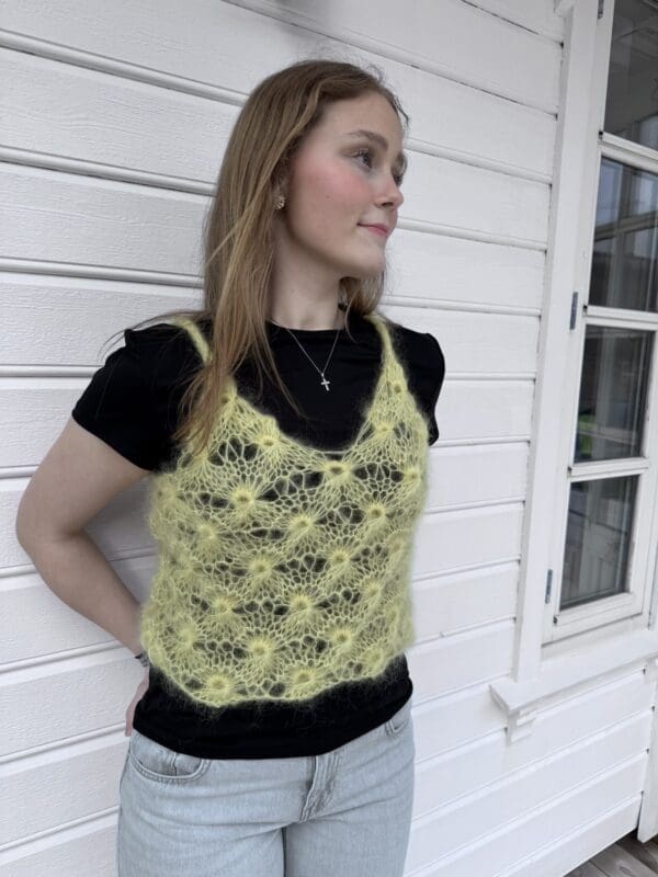 Toppen strikkes i Bella, hvis man ønsker en lettere top eller i Myk Påfugl, hvis