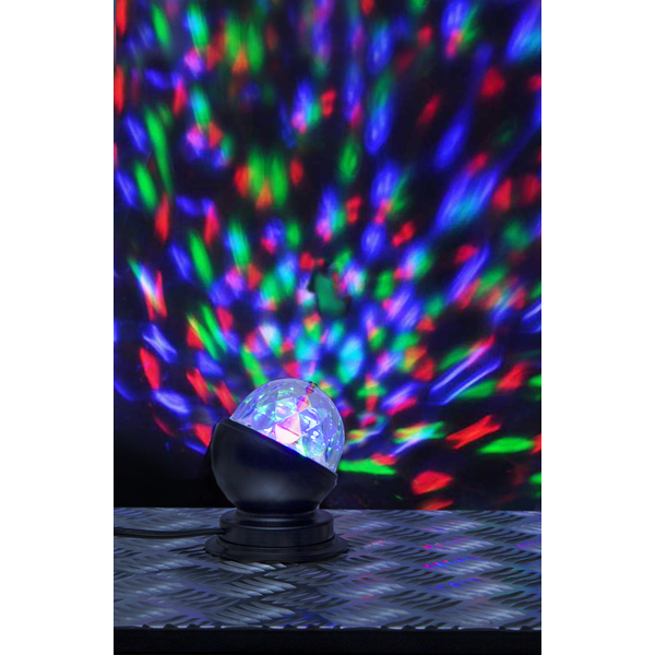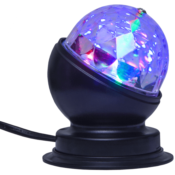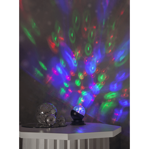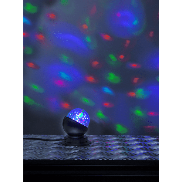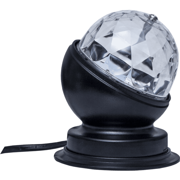 Et must til enhver disco-lejlighed! Lampen roterer og giver lyseffekter i RGB-farver. Disco-lampe med LED-belysning til indendørs brug. Den kan placeres på et bord eller monteres på væggen eller i loftet.