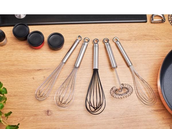 Piskerisets flade form er især velegnet til omrøring af små mængder og til forsigtigt at folde ingredienser i, når der arbejdes med sarte blandinger. Tåler opvaskemaskine.