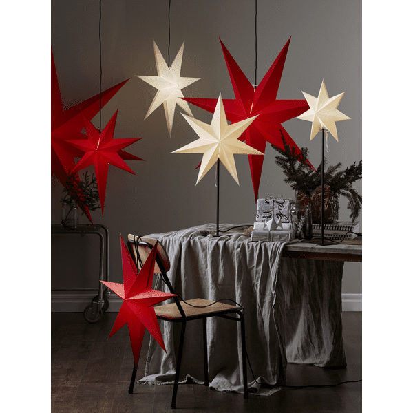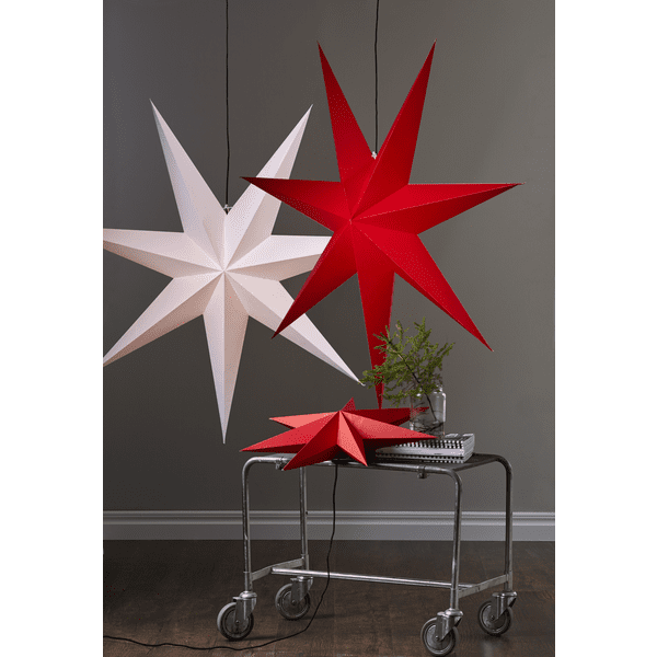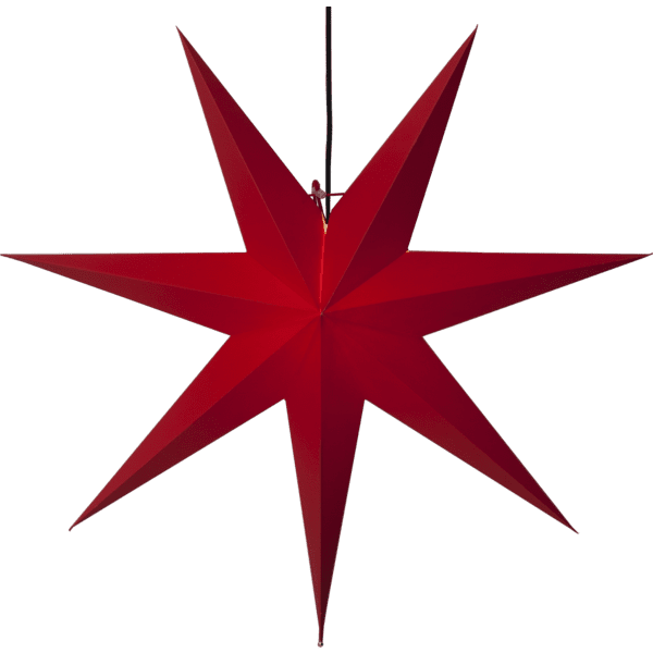 Rød papirstjerne med sort tekstilledning. Elegant stjerne at dekorere med i hjemmet. Stjernen har plads til én lyskilde. Højden er 70 cm.