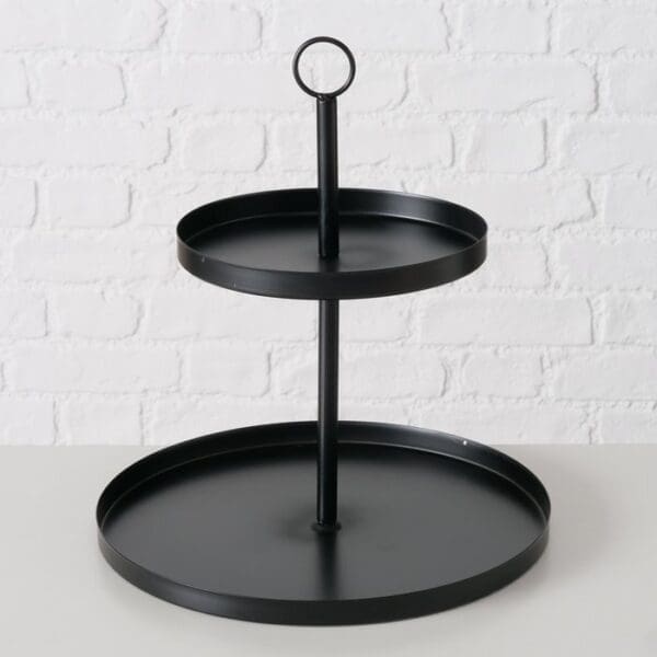 The Samina etagere is made of powder-coated iron in black and features a round shape with a diameter of 30 cm and a height of 33 cm. The surface is also lacquered to enhance material durability. This item is suitable for contact with food, fulfilling requirements for versatile presentation options in commercial environments.