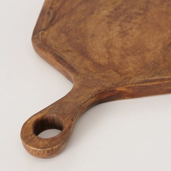 The Sanja serving board is crafted from mango wood and features a round shape. Its natural brown color emphasizes the clear design. With a height of 2.50 cm and dimensions of 46 cm in length and 34 cm in width, this handcrafted item demonstrates high-quality workmanship. The use of mango wood ensures material quality and a refined aesthetic for the collection.