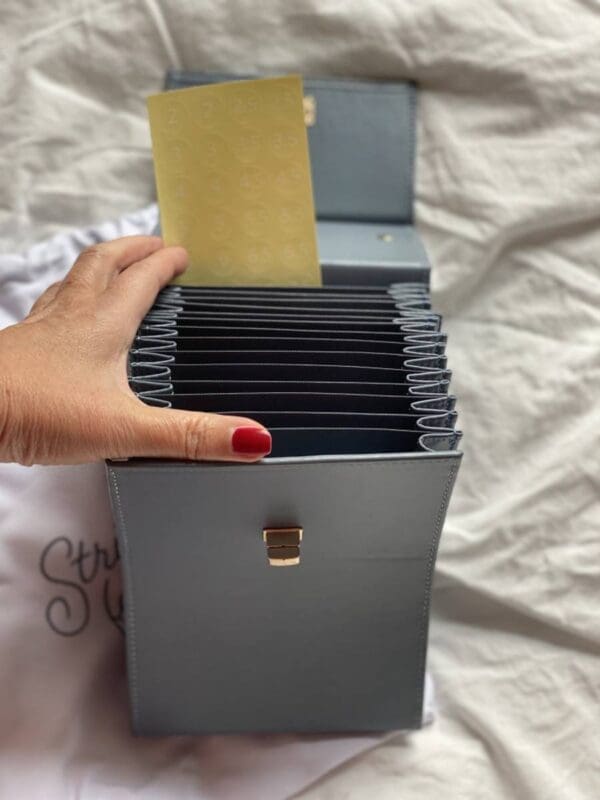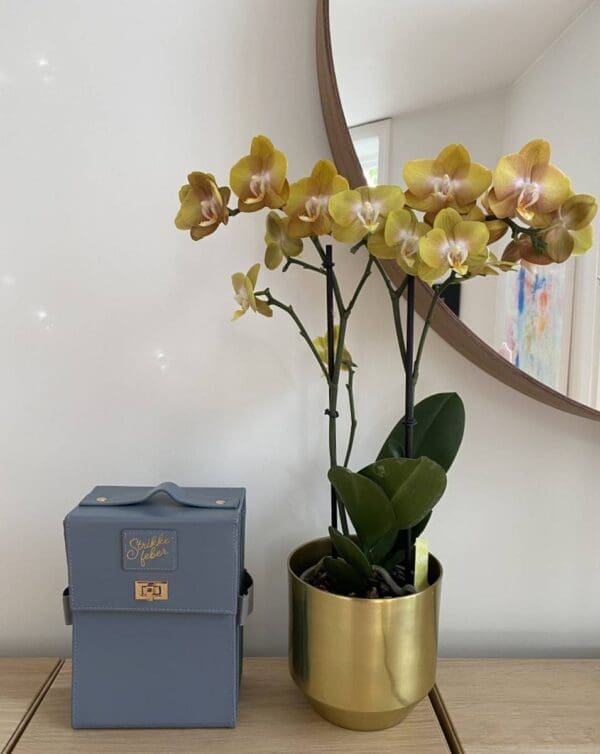 Etuiet leveres i glat kunstlæder med gulddetaljer og en guldfarvet lås i 3 farver: beige, sennepsgul og støvet blå.