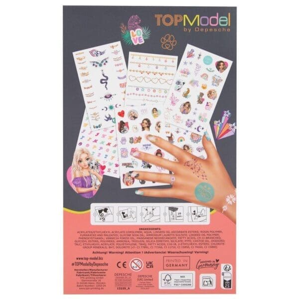 Pynt dig selv med disse fantastiske tatoveringer. Der er så mange TOPModel motiver at vælge imellem at det kan være svært at vælge, hvilken man skal bruge først. Pakken indeholder 6 ark med forskellige tatoveringer, som er både nemme at påføre huden og at fjerne igen.