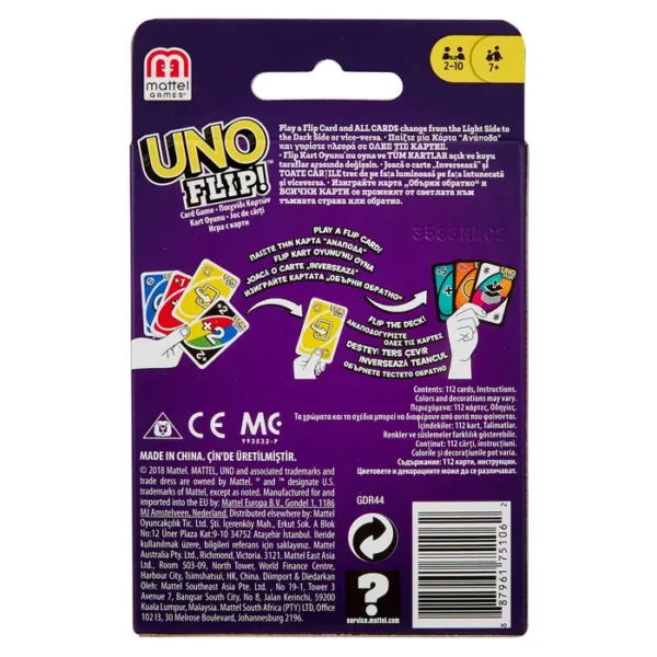 Gør dig klar til den nye udgave af det klassiske UNO™: UNO FLIP!™. Det er det hukommelsesspil, du allerede kender, men med nye spændende twists – dobbeltsidede kort, særlige FLIP-kort og hårdere straffe – som giver det klassiske spil mere konkurrencepræg. Kortene har en “lys side”, som fungerer som i det klassiske UNO™, og en “mørk side”, hvor straffene er superhårde. Når FLIP-kortet er blevet lagt, skal alle kort, du har på hånden, den lukkede bunke og bunken vendes om for at afsløre et helt nyt sæt tal og farver på den modsatte side! Den, der sidder med FLIP-kortet, bestemmer, om I spiller med den lyse side eller den mørke side af kortene – og hvornår I skifter. Den mørke side af kortene indeholder nye actionkort, som virkelig sætter gang i spillet, såsom Træk fem og Spring alle over. Læg en strategi for at stresse dine modstandere, og vær den første til at komme af med dine kort og vinde spillet. Når du kun har ét kort tilbage, skal du huske at råbe “UNO”! Det sjove kortspil for hele familien er perfekt til børn fra 7 år og opefter. Farver og mønstre kan variere.?UNO FLIP!™ er det klassiske kortspil, du kender, nu med et spændende twist!Dobbeltsidede kort og et særligt FLIP-kort giver det klassiske kortspil ekstra kant.?Hvis du lægger FLIP-specialkortet, skal alle kort vendes, også den lukkede bunke. Afslør et helt nyt sæt tal og farver på den modsatte side.?UNO FLIP!™ indeholder også nye sjove actionkort, såsom Træk fem og Spring alle over.Når du kun har ét kort tilbage, skal du huske at råbe “UNO!”?Indeholder 112 kort og spilleregler. Fra 7 år.