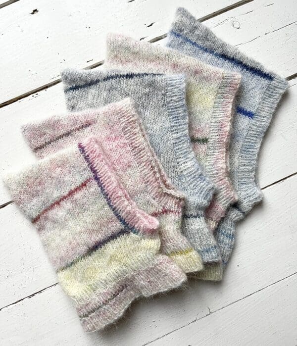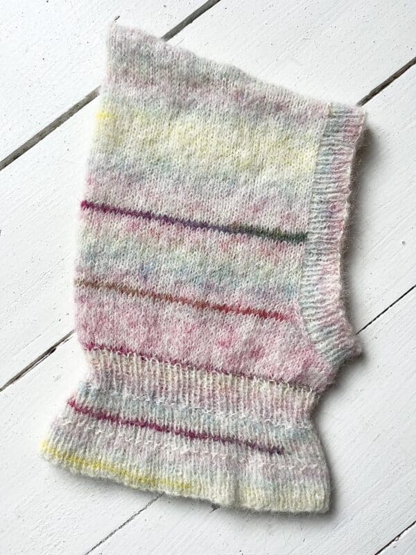 Strikkefasthed : 23 masker x 30 rækker = 10 x 10 cm i glatstrik på pind 4 mm.