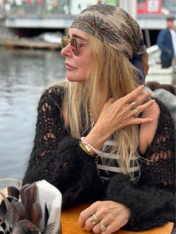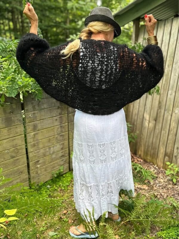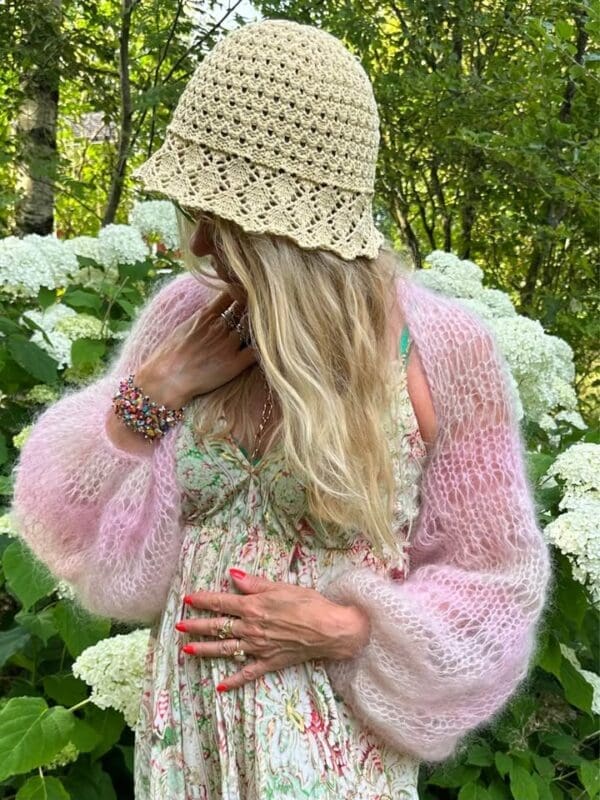 Til sidst hækles en kant af fastmasker langs åbningen (fra ærme til ærme, rundt om nakken). Det giver en samlet afslutning og stabiliserer formen. Kanten er valgfri og kan udelades, hvis man ønsker et mere åbent og råt udtryk.