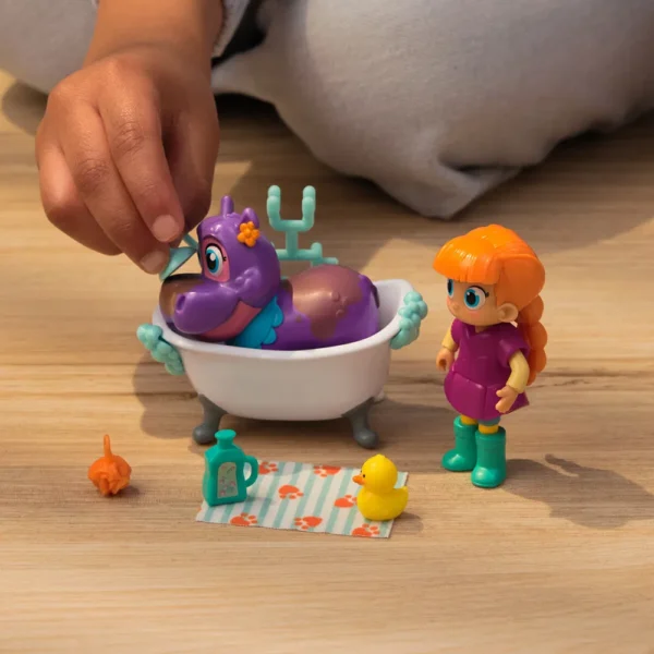 Skab spændende dyrlægeeventyr i Sweetwood, fulde af omsorg og helbredelse, med Junos Boblebad Pakke. Sættet inkluderer 8 cm høj Vidafigur med bevægelige lemmer og hendes flodhesteven, Juno, der skifter farve med varmt vand. Med i sættet er også et badekar, en gummiand, et håndklæde og sæbe, så Vida kan tage sig af sine venner, præcis som i serien. Disse legetøjsfigurer kan tages med overalt og er kompatible med Vidas Dyrlægeklinik, så dit barns yndlings figurer og dyrelegetøj altid er der, klar til at vækker glæde og nysgerrighed.